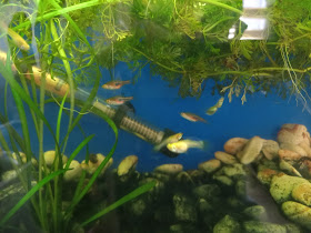 Geldik faunaya... Lepistes (Poecilia reticulata) -snow white, red blonde, half-black ve tamamen rastgele varyeteler var-, endler kanlı lepistes (Poecilia reticulata × wingei) ve ateş ışığı rasbora (Trigonostigma hengeli):